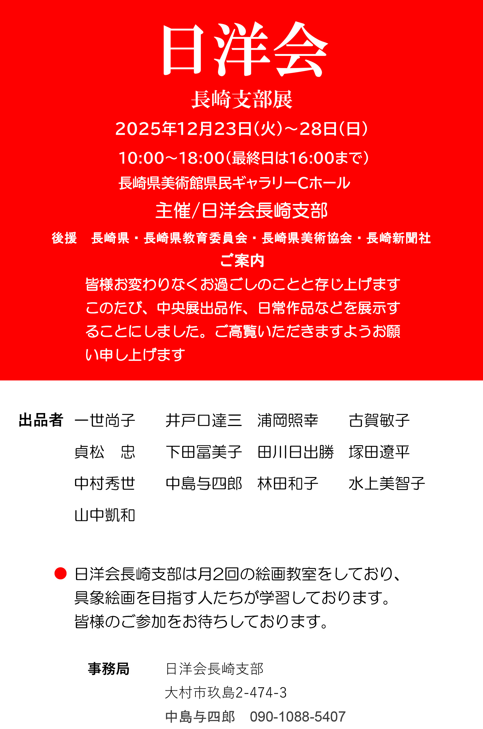 2025.12.17 個展・グループ展 日洋会 長崎支部展(2025年12月23日~開催)のお知らせ 「日洋会 長崎支部展」を12月23日(火)より長崎県美術館 県民ギャラリーにて開催いたします。 是非ご高覧ください。 会 期 2025年12月23日(火)~28日(日) ※10:00~18:00(※最終日は16時まで) 会 場 長崎県美術館 県民ギャラリーCホール 〒850-0862 長崎県長崎市出島町2−1 »MAP » 新着情報一覧